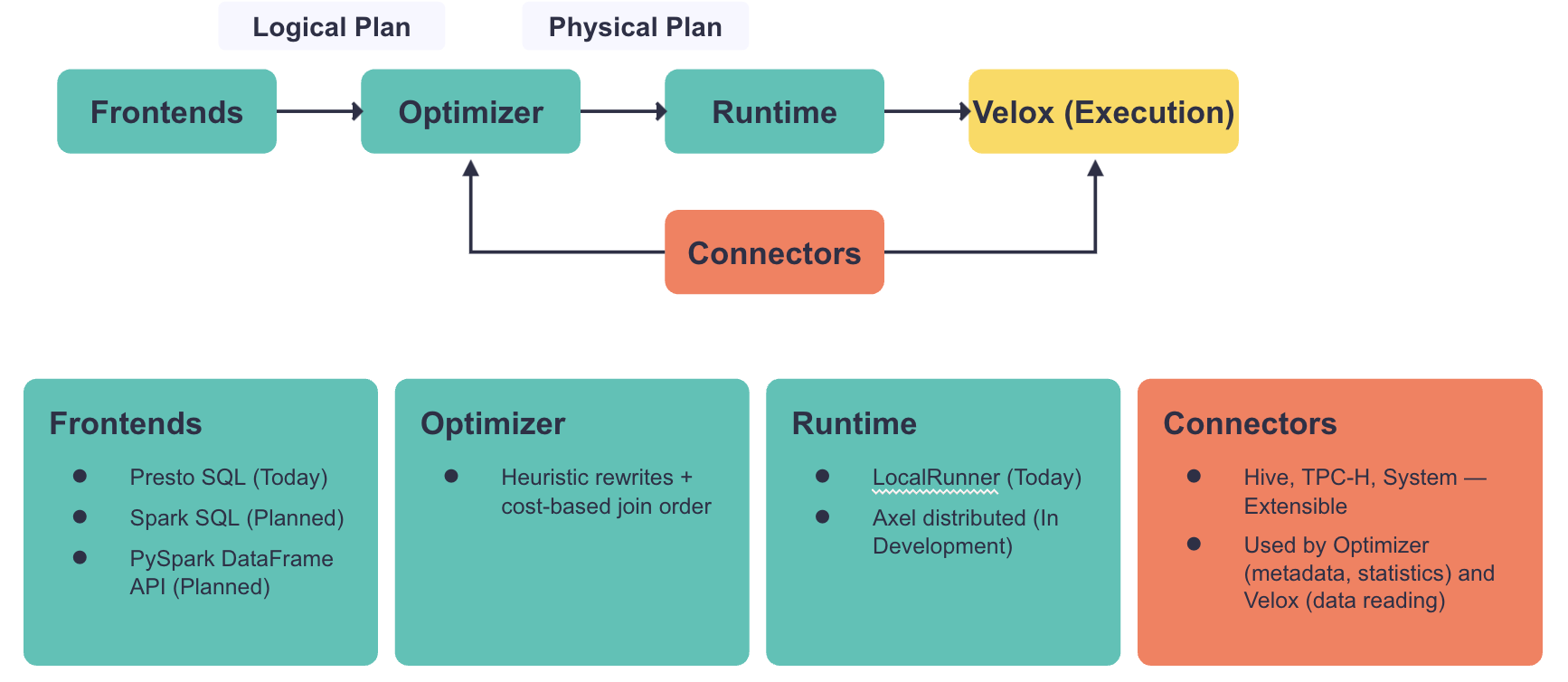 Connectors are also unified. Planning-time logic (metadata, statistics, partition pruning) and execution-time logic (data reading) live in the same language, unlike Prestissimo and Gluten where they are split across Java and C++.