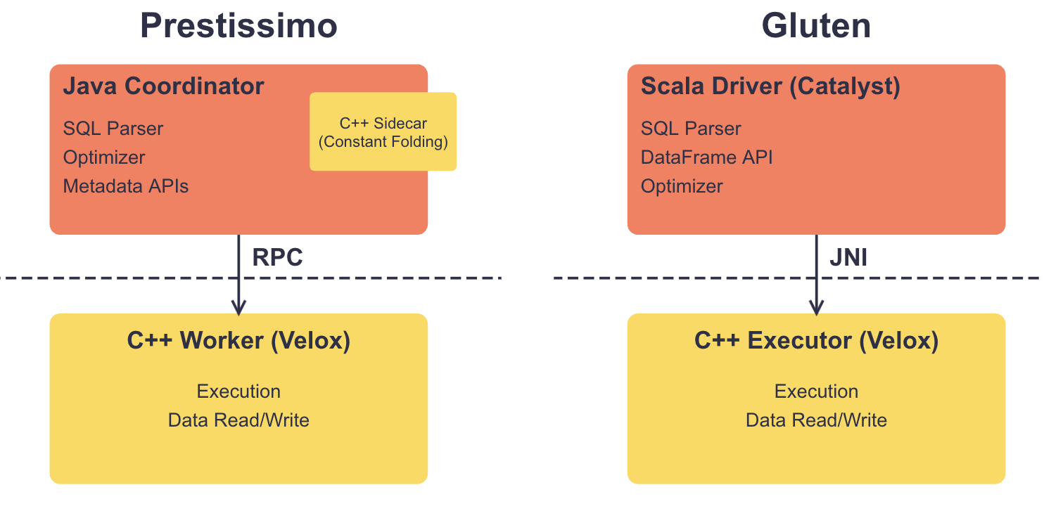 Under the hood, the architectures are split along language boundaries. In Prestissimo, Java coordinator handles SQL parsing, optimization, and orchestrates distributed execution; C++ worker handles local execution. They connect via RPC — relatively clean, but connectors are split: metadata in Java, data reading in C++. Constant folding is another pain point — it happens in the coordinator (Java) but must produce results compatible with Velox execution, currently solved via a C++ sidecar, but clunky. In Gluten, Spark's Catalyst handles SQL parsing, DataFrame API, optimization, and orchestrates distributed execution; Velox handles local execution. They connect via JNI — more complex, harder to debug.