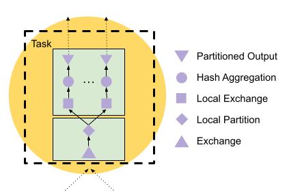 Now let’s focus on the stage 2 query fragment. Each stage 2 worker has the following plan fragment: PartitionedOutput over Aggregation over LocalExchange over Exchange.
