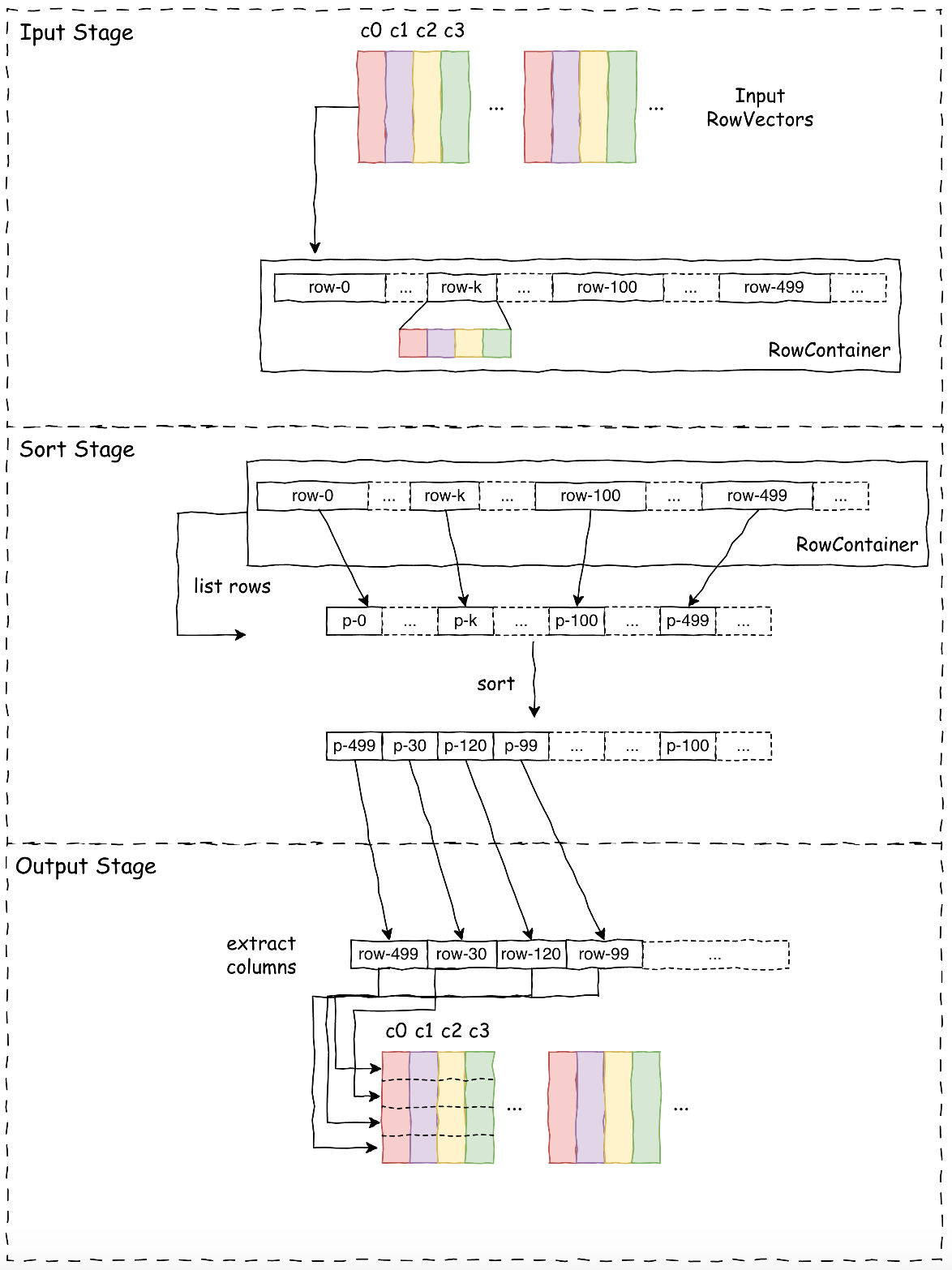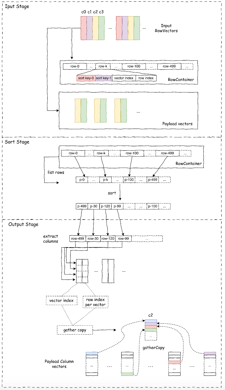 - Input Stage: Holds the input vector (its shared pointer) in a list, serializes key columns and additional index columns (VectorIndex and RowIndex) into rows, stored in a RowContainer.