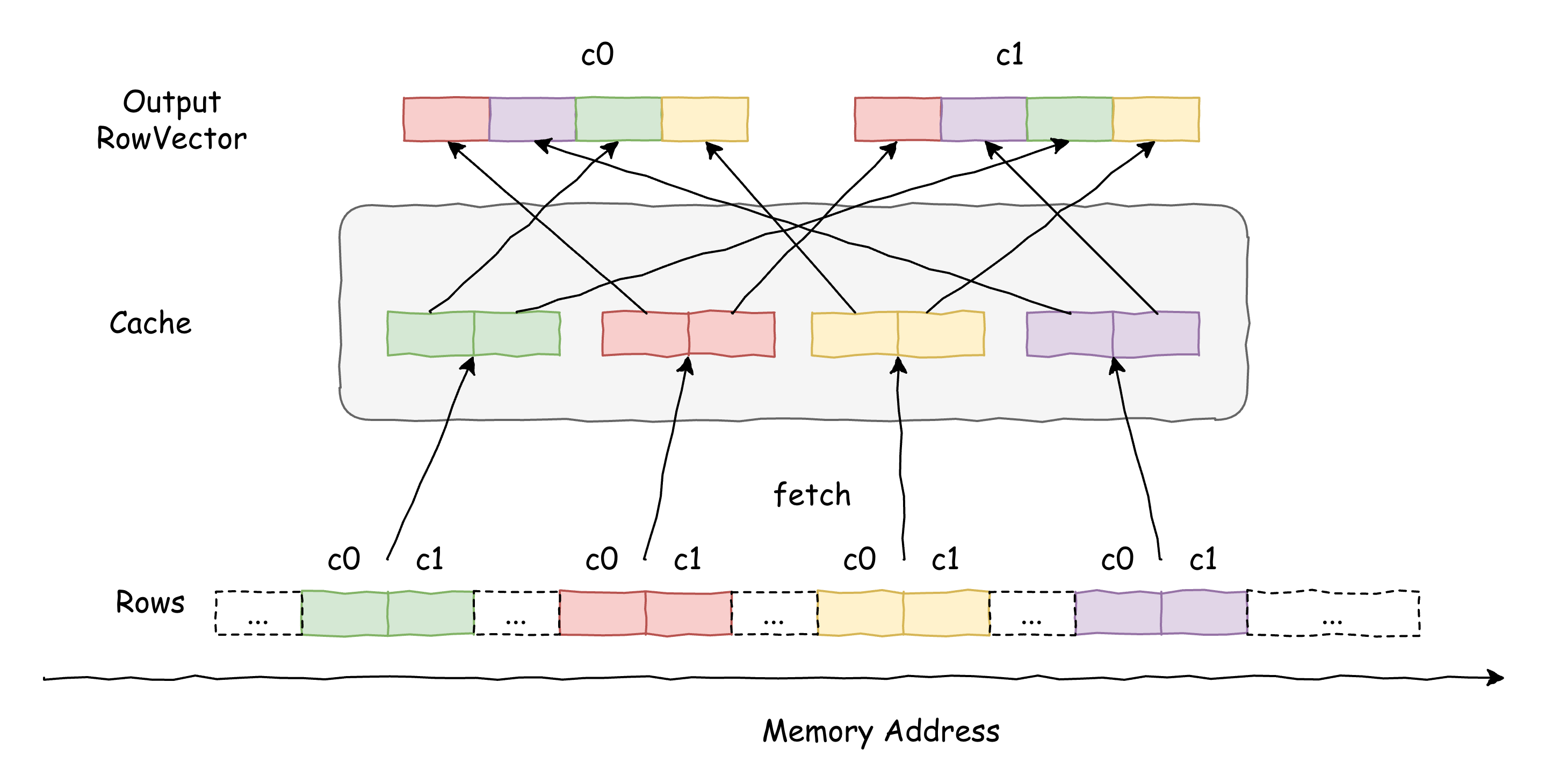 In contrast, Velox’s current row-based approach serializes all input vectors into rows, with each allocation producing a contiguous buffer that holds a subset of those rows. Despite the serialization, the row layout preserves strong locality when materializing output vectors: once rows are in the cache, they can be used to extract multiple output columns. This leads to much better cache-line utilization and fewer cache misses than a columnar layout, where each fetched line often yields only a single value per column. Moreover, the largely sequential scans over contiguous buffers let the hardware prefetcher operate effectively, boosting throughput even in the presence of serialization overhead.